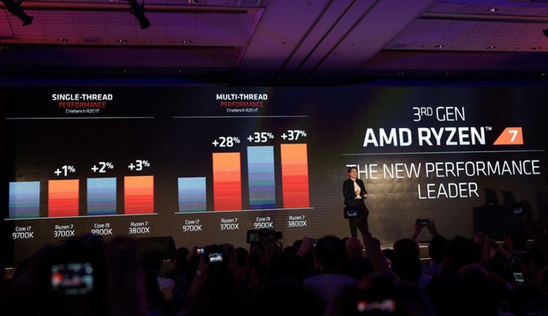 Ngoài ra, AMD cũng giới thiệu Ryzen 7 3800X (399 USD) có 8 lõi/16 luồng, tốc độ 3,9 GHz / 4,5 GHz và Ryzen 7 3700X (334 USD) cũng có 8 lõi, TDP 65W thay vì 105W như người tiền nhiệm 2700X nhưng tốc độ lại cải thiện 15% trong thử nghiệm Cinebench R20 đơn luồng và nhanh hơn 18% trong khi chạy đa luồng. So với Intel i9-9700K (385 USD), nó nhanh hơn 28% trong thử nghiệm đa luồng Cinebench.