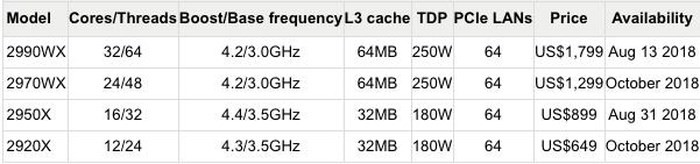 AMD cho biết, Ryzen Threadripper 2990WX hiện đã được phân phối ra thị trường toàn cầu. Trong khi đó, các phiên bản thấp hơn sẽ được tung ra trong những tháng tới, cụ thể như sau: Ryzen Threadripper 2950X vào 31/8, Ryzen Threadripper 2970WX và 2920X vào tháng 10/2018.