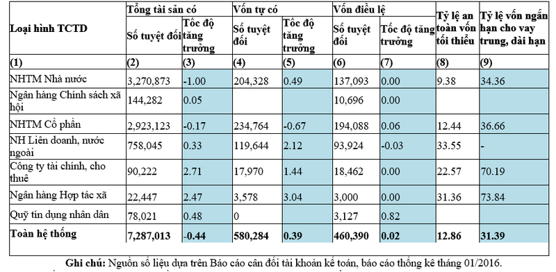Cùng với đó, tổng tài sản của các tổ chức tín dụng cũng đã co lại, giảm 0,44% so với cuối năm 2015, còn 7.287.013 tỉ đồng. Hiện tượng suy giảm này có thể hiểu là do tăng trưởng tín dụng vào thời điểm tháng 1 năm nay giảm mạnh, một phần vì yếu tố mùa vụ, thời điểm chuẩn bị Tết Nguyên đán. Tới đây khi tín dụng tăng thì tổng tài sản các tổ chức tín dụng sẽ tăng trở lại.