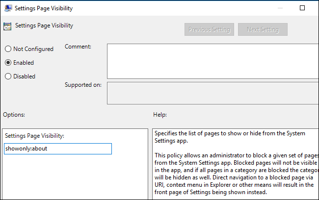 Kể từ bản cập nhật Creators Update, người dùng đã có thể ẩn các tùy chọn thiết lập trong ứng dụng Settings nếu không muốn người khác "táy máy", thiết lập không đúng dẫn đến các sự cố không đáng có.
