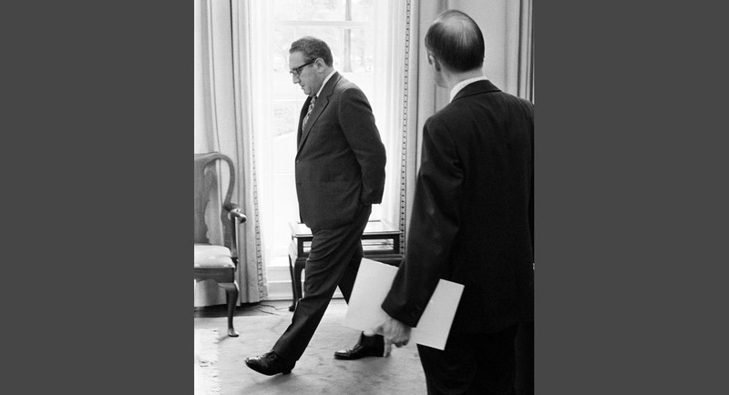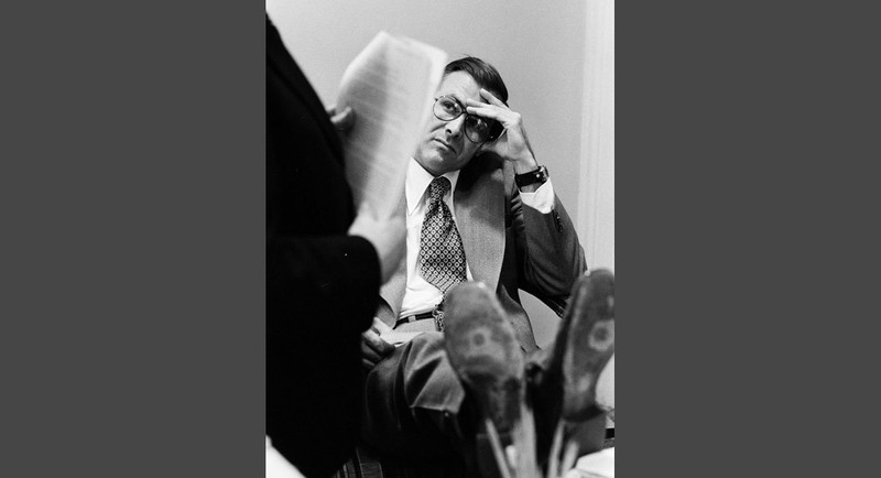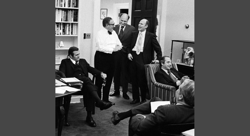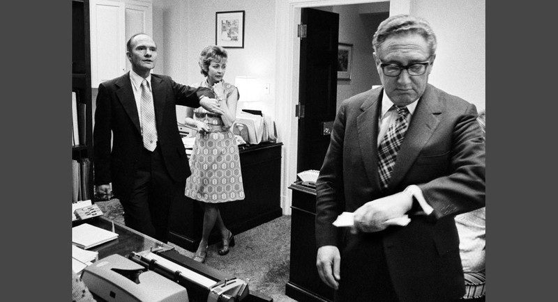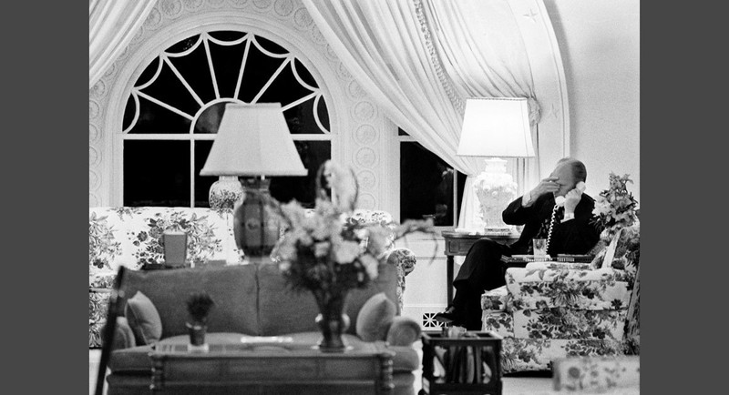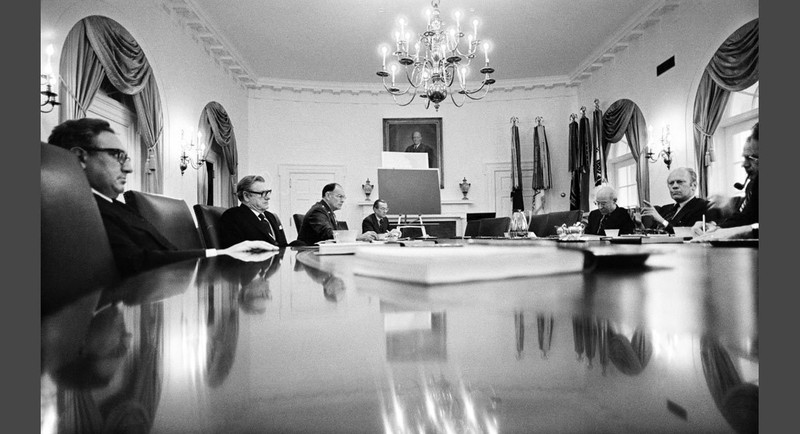 Ngày 9/4/1975: Các lực lượng quân đội Việt Nam đang tiến sát đến Sài Gòn, các vùng miền Trung hoàn toàn thất thủ. Giám đốc CIA William Colby và Bộ trưởng Quốc phòng Jim Schlesinger vô cùng phiền muộn khi tôi chụp ảnh họ trong phòng nội các trước cuộc họp kín về tình hình Đông Dương.