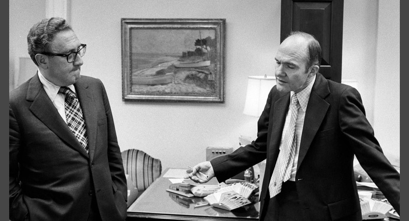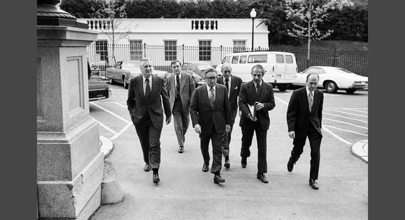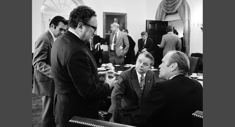 Từ trái sang phải: Giám đốc CIA William Colby, Ngoại trưởng Henry Kissinger và Chủ tịch Hội đồng tham mưu Liên quân George Brown. 19h30, ngày 28/4/1975: Giám đốc CIA William Colby mở đầu cuộc thảo luận tại cuộc họp, báo cáo, "Việt Cộng đã từ chối đề nghi ngừng bắn của tổng thống Dương Văn Minh.