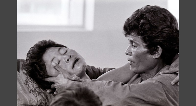 Một người chồng Camphuchia đang an ủi người vợ của mình, bà bị thương và đang lặng lẽ ra đi trên tay chồng.