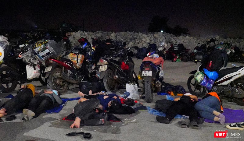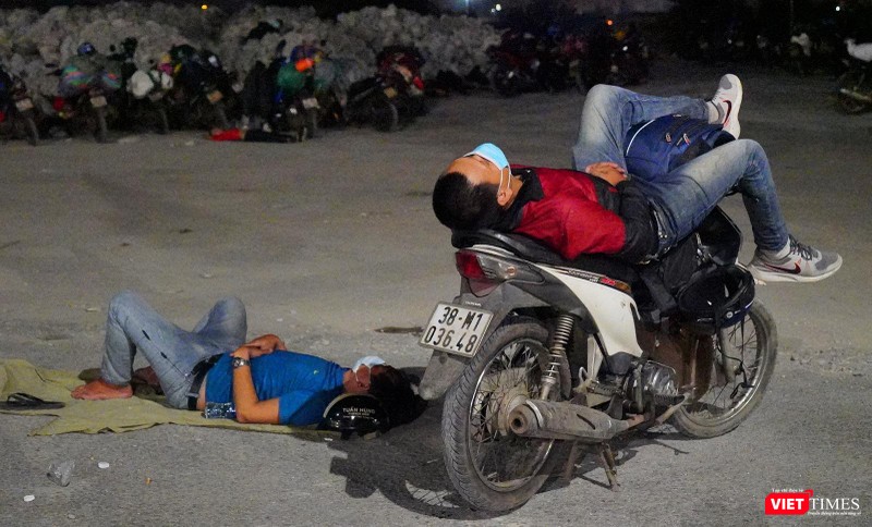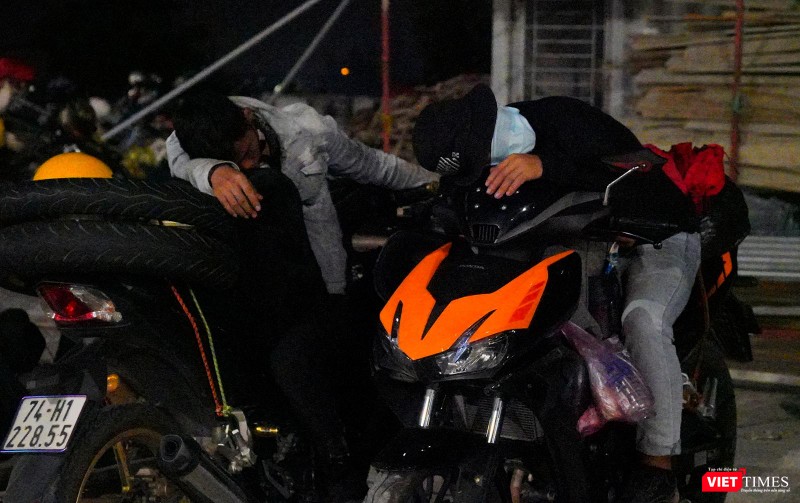 Trong lúc đội tình nguyện bảo dưỡng xe thì người dân tranh thủ ngã giấc sau hành trình dài từ TP HCM về quê