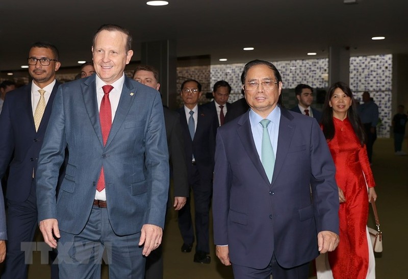 Chủ tịch Nhóm Nghị sĩ Hữu nghị Brazil-Việt Nam Marcio Honaiser đón Thủ tướng Phạm Minh Chính. (Ảnh: Dương Giang/TTXVN)