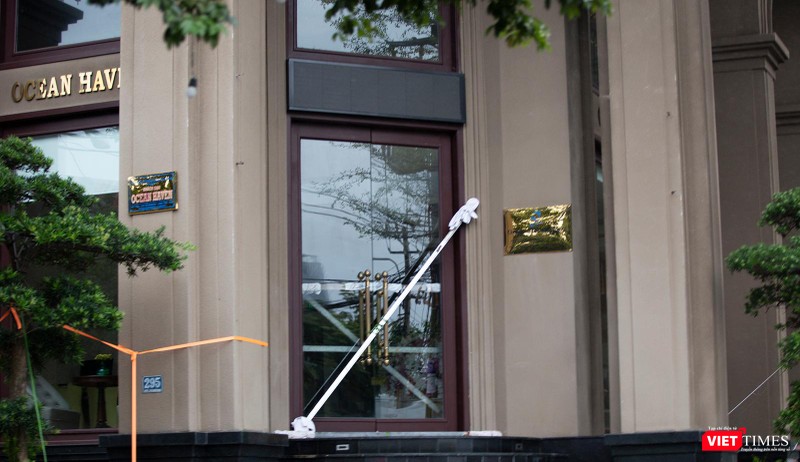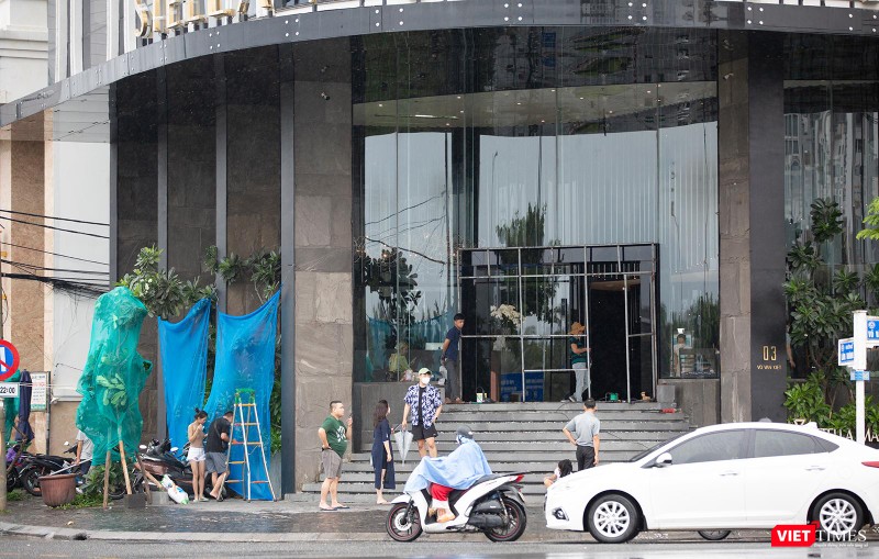 Một khách sạn trên đường Võ Nguyên Giáp khẩn trương gia cố cửa kính |