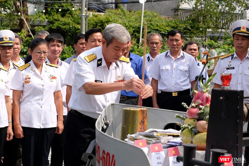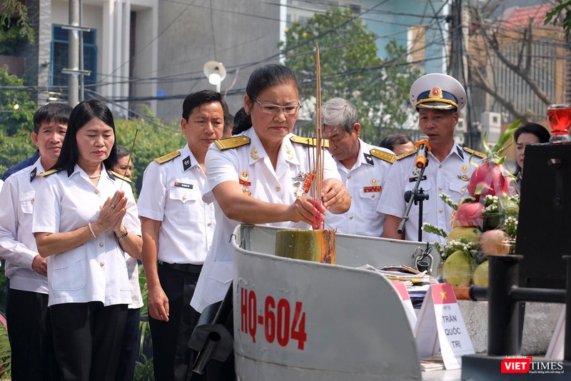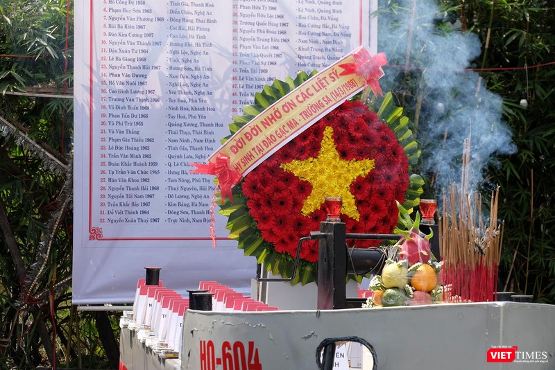 bài vị của các chiến sĩ đã hy sinh và vòng hoa hình cờ Tổ quốc. HQ-604 là con tàu đã bị lính Trung Quốc bắn chìm ngày 14/3/1988 khiến 64 chiến sĩ của ta hy sinh.