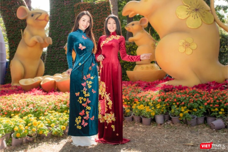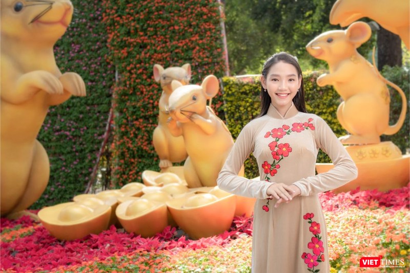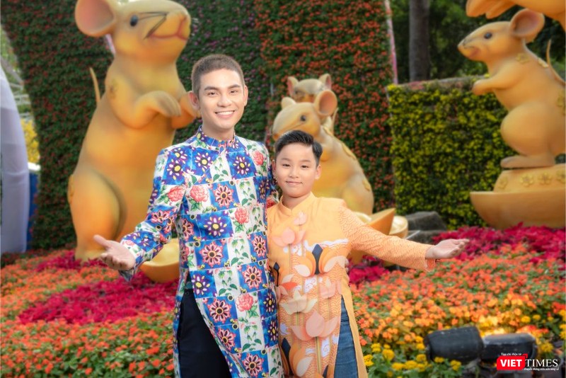Mẫu nhí Đại sứ áo dài Việt Nam Gia Huy, Minh Anh diện áo dài của NTK Việt Hùng xúng xính đi chơi Tết giữa hội hoa xuân, chụp hình cùng các biểu tượng may mắn, phúc lộc từ chú chuột vàng Canh Tý 2020.