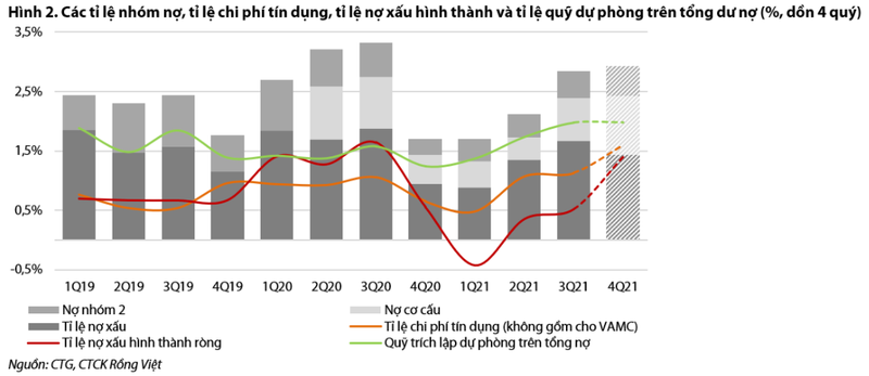 “Tỉ lệ hình thành nợ xấu ròng (dồn 12 tháng) của quý 4/2021 ước tính đạt 1,4%, được hỗ trợ bởi sự phục hồi trong giai đoạn tái mở cửa của một số khách hàng lớn bị phân loại thành nợ xấu trong quý 3”, báo cáo của VDSC cho biết.