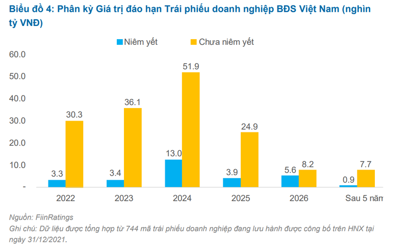 Cụ thể, tính đến cuối năm 2021, quy mô dư nợ trái phiếu doanh nghiệp bất động sản đạt khoảng 189.000 tỉ đồng, trong đó, dữ liệu của FiinGroup cho thấy, có tới 73% dư nợ sẽ có điểm rơi đáo hạn vào giai đoạn 2022 – 2024