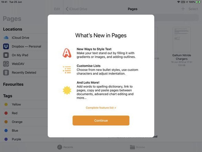 Riêng iWork trên iOS sẽ được tăng cường thêm hàng loạt tính năng mới liên quan đến bút cảm ứng Apple Pencil, bao gồm cả tùy chọn kích hoạt giữa tích năng vẽ, chọn đối tượng hoặc cuộn trang. Nếu chạm nhẹ 2 lần vào Apple Pencil thế hệ mới (thứ hai), người dùng có thể chuyển nhanh giữa những chế độ này. Người dùng cũng có thể bổ sung thêm các từ mới vào thư viện đánh vần (Spelling) của ứng dụng; và thay đổi cách viền bảng biểu nếu muốn.