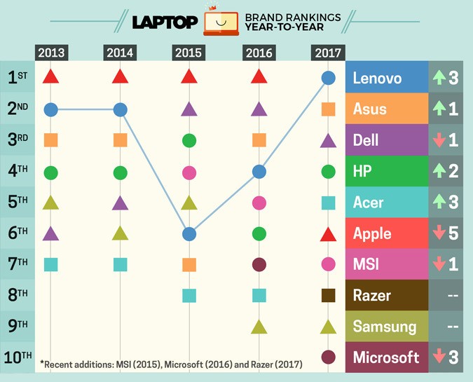 Trong thống kê các laptop tốt nhất và tệ nhất năm 2017 của LaptopMag, Apple không còn là thương hiệu số 1 về laptop. Hãng hiện đã tụt xuống vị trí thứ 5 trên bảng xếp hạng.