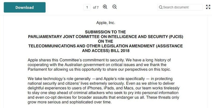 Apple cho biết luật mới đang được đề xuất của Úc có thể khiến công ty vi phạm pháp lý của các khu vực khác như Mỹ và Châu Âu trong việc xâm phạm quyền riêng tư của người dùng trên toàn thế giới. Trong thư gửi đến Quốc hội Úc, Apple có viết: