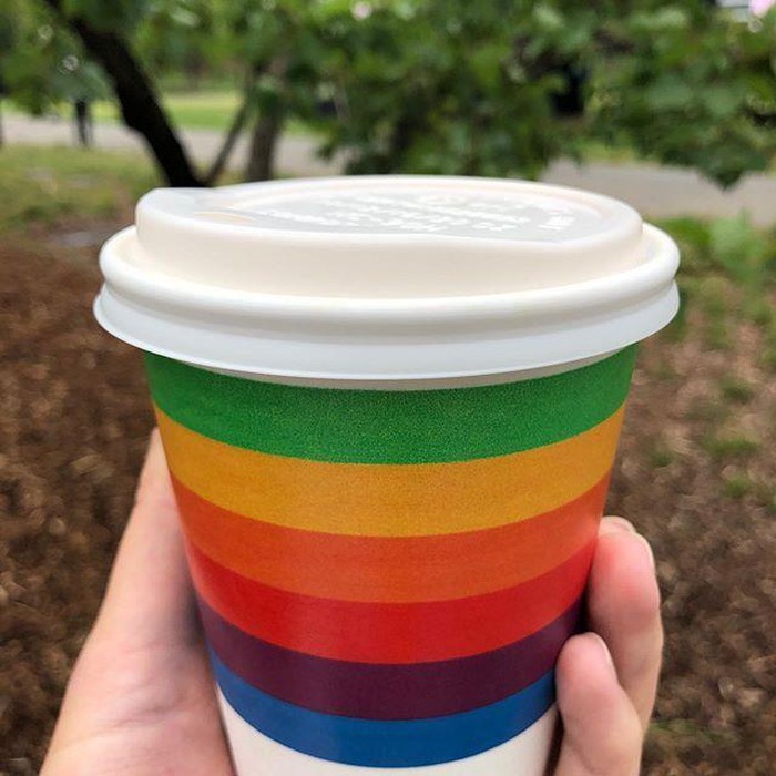 Tách cà phê tại khu vực Caffè Macs dành cho nhân viên cũng được trang trí màu sắc vui vẻ này. Sân khấu và cách trang trí cầu vồng ở nhiều khu vực là ý tưởng thiết kế của chính Jony Ive, "kiến trúc sư trưởng" tại Apple.