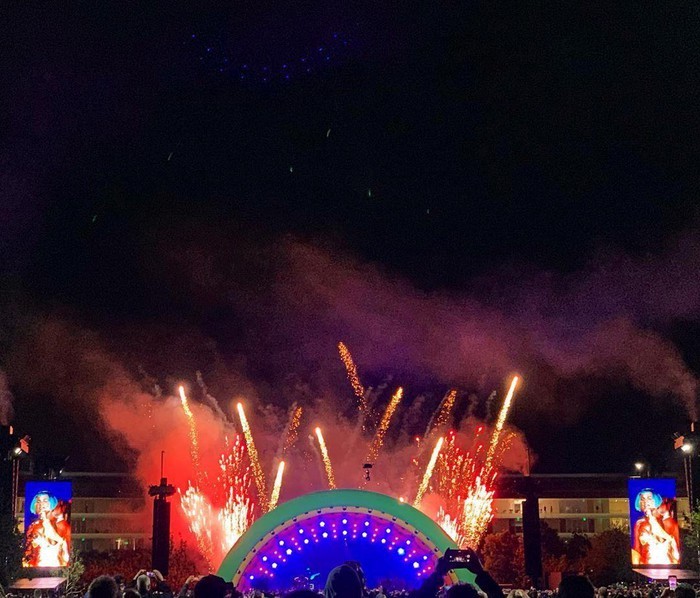 Pháo hoa cũng được sử dụng trong buổi trình diễn đầy âm thanh và màu sắc này. Hàng nghìn nhân viên Apple đã hòa vào âm nhạc sôi động và vũ điệu cuồng nhiệt của các nghệ sĩ trên sân khấu.