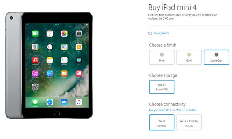 Đối với iPad mini 4, Apple vừa đưa ra một bản nâng cấp về dung lượng lưu trữ lên 128GB. Giá cho bản Wifi Only là 399 USD và bản Wifi 4G là 529 USD.