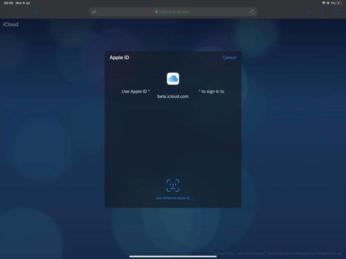Truy cập icloud.com, người dùng được chuyển hướng đến beta.icloud.com và sau đó được nhắc đăng nhập vào trang web bằng Apple ID được liên kết với thiết bị.