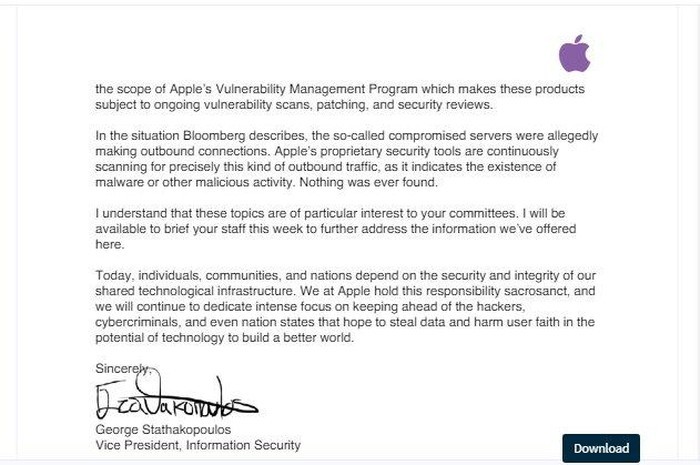 Apple vẫn liên tục phủ nhận về hành động này, đặc biệt vừa qua George Stathakopoulos - Phó Chủ tịch an ninh thông tin của công ty đã trực tiếp gửi thư tới Quốc hội với lời khẳng định đanh thép nhất từ trước đến giờ: "Apple chưa bao giờ tìm thấy những con chip độc hay hoặc các lỗ hổng bảo mật được cố ý cài vào trong bất cứ máy chủ nào. Chúng tôi cũng chưa từng cảnh báo cho FBI bất cứ mối quan tâm về vấn đề bảo mật nào như những gì được nêu trong bài báo, cũng như việc FBI chưa bao giờ liên lạc với chúng tôi để có các cuộc điều tra tương tự".