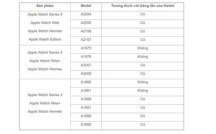 Danh sách những mẫu Apple Watch tương thích với băng tần của Viettel.