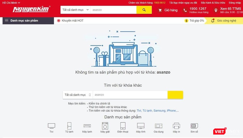 Việc tìm kiếm cụm từ “Asanzo” trên một số trang thương mại điện tử (Adayroi,... ) cũng cho ra kết quả “không tìm thấy sản phẩm” hoặc hiển thị sản phẩm của thương hiệu khác.