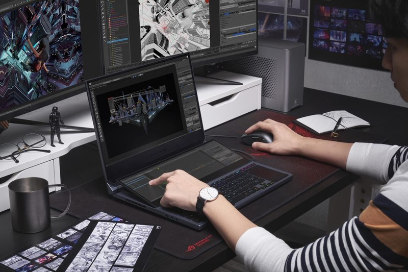 Việc thêm màn hình phụ là nỗ lực không hề đơn giản, nơi mọi milimet đều quan trọng. Màn hình IPS 14.1” (3840 x 1100) trên ROG Zephyrus Duo 15 là màn hình phụ lớn nhất từng được trang bị trên laptop gaming. Khi mở laptop, ROG ScreenPad Plus sẽ tự động nghiêng lên một góc 13° giúp dễ dàng quan sát và tương tác với màn hình cảm ứng. Từ đó, người dùng có thể ứng dụng màn hình phụ này vào nhiều tình huống khác nhau ngay cả trong game lẫn sáng tạo nội dung. ASUS ROG cũng đang làm việc với nhiều nhà phát triển phần mềm ứng dụng và games để mang lại nhiều tính năng hơn cho màn hình phụ này.