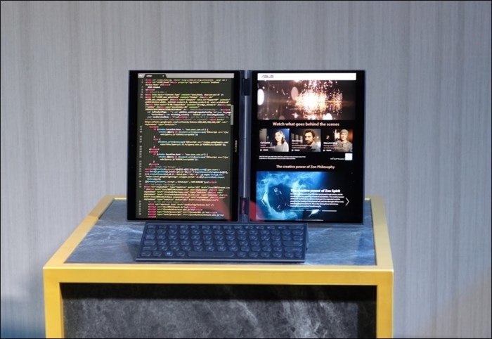 Thiết kế này loại bỏ hoàn toàn bàn phím vật lý và bàn di cảm ứng thông thường, thay thế vào đó là sự linh hoạt – màn hình thứ hai có thể đóng vai trò như một màn hình mở rộng hoặc trở thành một giao diện tương tác bổ sung có thể tùy chỉnh.