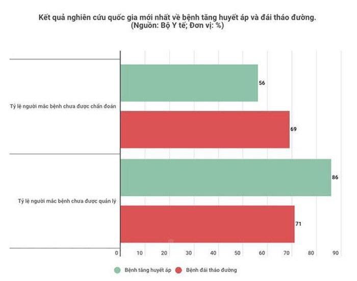 Tại Việt Nam, theo kết quả nghiên cứu quốc gia mới nhất của Bộ Y tế, tỷ lệ người mắc bệnh tăng huyết áp chưa được chẩn đoán là 56%, tỷ lệ này ở bệnh đái tháo đường lên đến lên đến 69%; về quản lý bệnh, tỷ lệ tăng huyết áp chưa được quản lý là 86%, tỷ lệ này ở đái tháo đường là 71%.