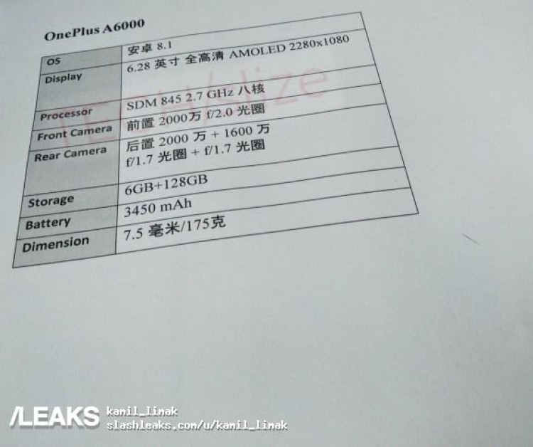 Một hình ảnh rò rỉ khác của SlashLeaks hé lộ nhiều điều về OnePlus 6. Đầu tiên máy có trọng lượng 175g và dày 7.5mm. Màn hình OLED 6,28 inch độ phân giải 2280x1080 với tỷ lệ 19:9. OnePlus công bố màn hình chiếm 90% diện tích mặt trước. Khả năng chụp ảnh của OnePlus 6 cũng được cải tiến đáng kể với camera trước 20 MP khẩu độ f/2.0; cụm camera kép phía sau gồm 1 ống kính 20 MP khẩu độ f/1.7 và ống kính 16 MP khẩu f/1.7.