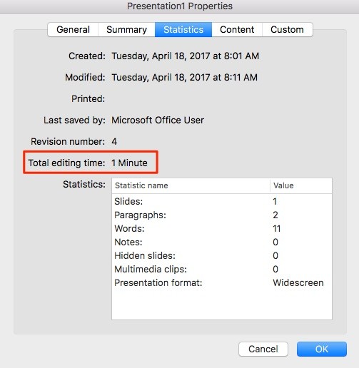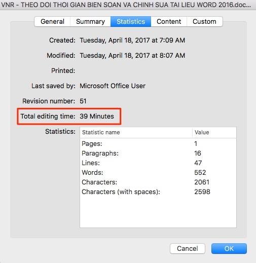 Bạn sẽ thấy chỉ số Tổng thời gian Chỉnh sửa tại thẻ Statistics. Finder của macOS không hỗ trợ tuỳ chọn này. Do vậy, bạn luôn phải mở Word nếu muốn kiểm tra chỉ số Total Editing Time.