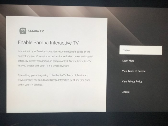 Điều đáng nói là màn hình hiện lên khi người dùng cài đặt nói rằng kích hoạt Samba TV đồng nghĩa với đồng ý với điều khoản dịch vụ và chính sách quyền riêng tư song người xem không thể đọc được chúng trừ phi họ lên mạng hay bấm vào màn hình khác trên tivi. Chính sách quyền riêng tư của họ dài hơn 4.000 từ, còn điều khoản được nêu bằng hơn 6.500 từ. Có lẽ, không ai kỳ vọng mình sẽ bị chính chiếc tivi của mình “bán” thông tin cho các nhà quảng cáo trực tuyến.