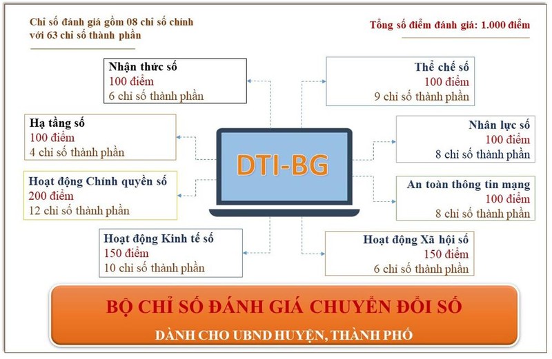 Hằng năm, các cơ quan, đơn vị, địa phương cung cấp kết quả thực hiện chuyển đổi số trên Hệ thống phần mềm chấm điểm DTI tỉnh Bắc Giang (Số liệu báo cáo được tính từ ngày 15/10 của năm trước đến ngày 15/10 của năm đánh giá). Sở Thông tin và Truyền thông thực hiện đánh giá độc lập và trình Chủ tịch UBND tỉnh công nhận kết quả xếp loại trước 15/12 hằng năm.