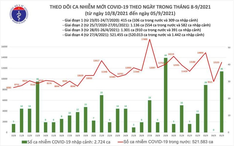 Tính từ 17h ngày 04/9 đến 17h ngày 05/9, trên Hệ thống Quốc gia quản lý ca bệnh COVID-19 ghi nhận 13.137 ca nhiễm mới, trong đó 36 ca nhập cảnh và 13.101 ca ghi nhận trong nước, trong đó có 7.521 ca trong cộng đồng.