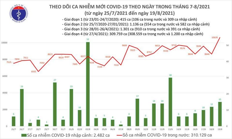 Cụ thể, tính từ 18h30 ngày 18/8 đến 19h ngày 19/8, trên Hệ thống Quốc gia quản lý ca bệnh COVID-19 ghi nhận 10.654 ca nhiễm mới, trong đó 15 ca nhập cảnh và 10.639 ca ghi nhận trong nước, trong đó có 6.407 ca trong cộng đồng.