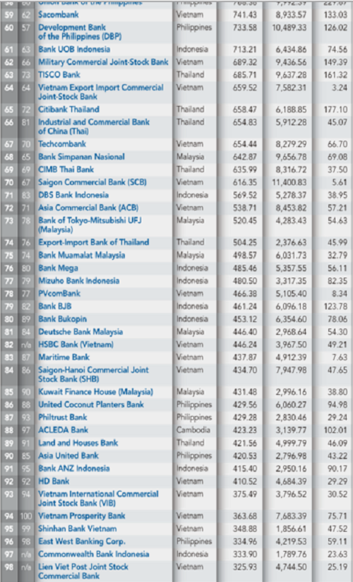 Thống trị danh sách về giá trị tài sản là các ngân hàng Malaysia, Singapore và Thái Lan, đóng góp gần 75% tổng.