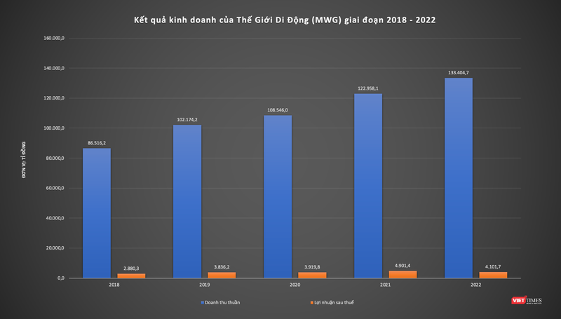 Lũy kế cả năm 2022, doanh thu thuần của MWG đạt 133.405 tỉ đồng, tăng 8% so với năm 2021, lợi nhuận sau thuế giảm 16% đạt 4.102 tỉ đồng, lần lượt hoàn thành 95% kế hoạch doanh thu và 65% mục tiêu lợi nhuận năm.
