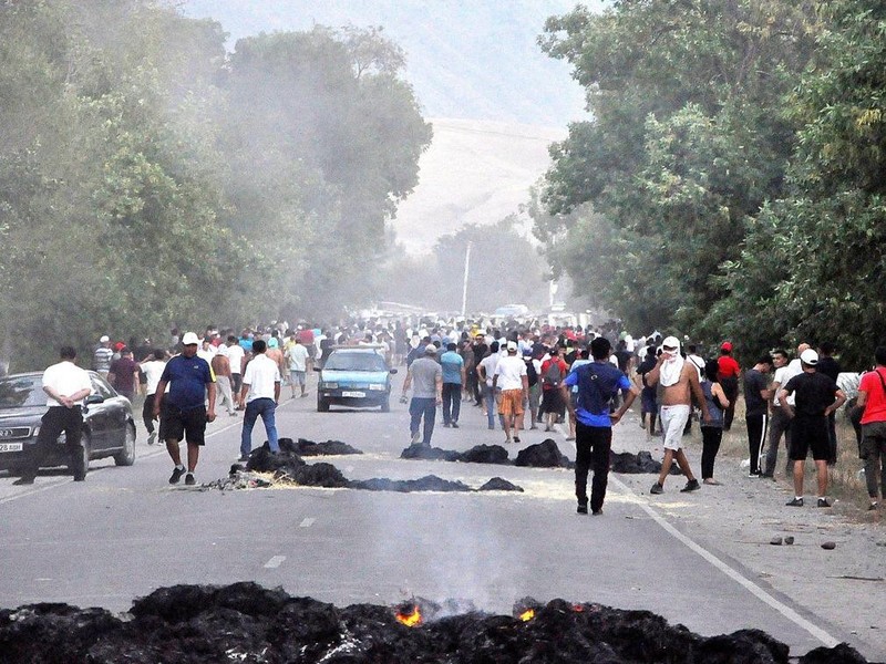 Tại làng Koy Tash, nhiều người đã ném đá vào các nhân viên thực thi pháp luật, thậm chí châm lửa đốt vỏ (lốp) xe trên đường để ngăn những người dẫn giải ông Atambayev di chuyển suôn sẻ.(Ảnh dưới)