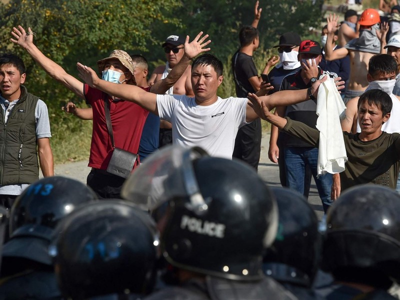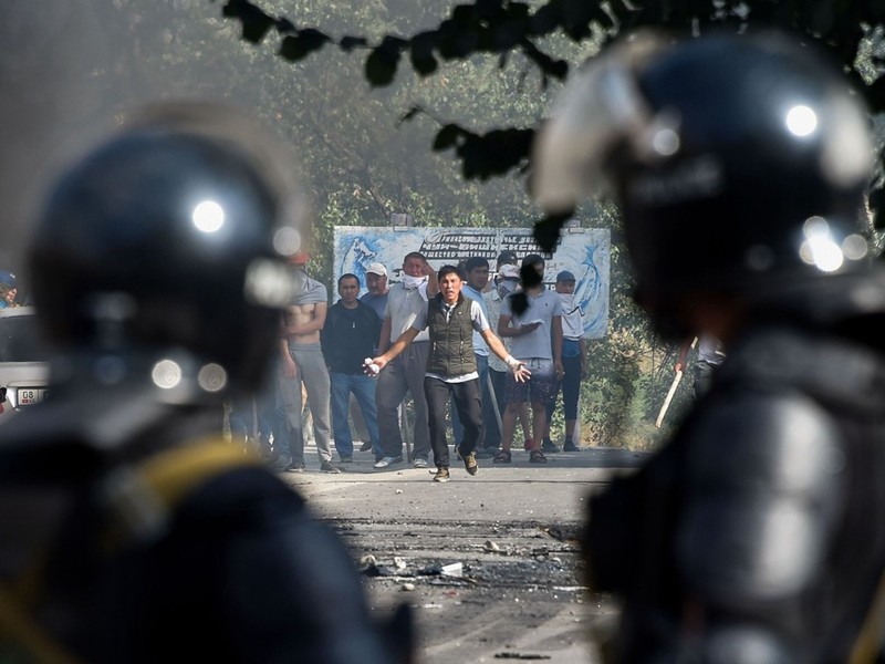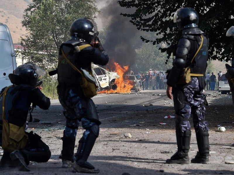 Mặc dù ông Atambayev đã bị bắt, xung đột tiếp tục bùng nổ giữa những người ủng hộ ông và các nhân viên thực thi pháp luật ở làng Koy Tash và khu vực lân cận. Ảnh: các thành viên của lực lượng đặc biệt người đối đầu với những người biểu tình.