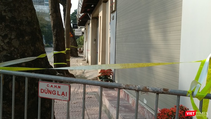 Cách đó vài bước chân, cũng trên mặt phố Nguyễn Khắc Nhu, ngôi nhà của vợ chồng ông T. và bà C. tại số 7 đã được lực lượng chức năng dán niêm phong, chăng dây cảnh báo và đặt biển khu vực cách ly cùng hai ngồi nhà sát vách.