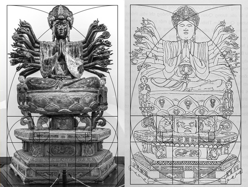Tương quan tỷ lệ giữa tượng Quan Âm của người Việt với tác phẩm Vitruvian Man của danh họa Leonardo Da Vinci. Ảnh trái: Bản vẽ trong cuốn Nghệ thuật tạo tác tượng Phật trong các ngôi chùa Việt (không có đường kẻ).