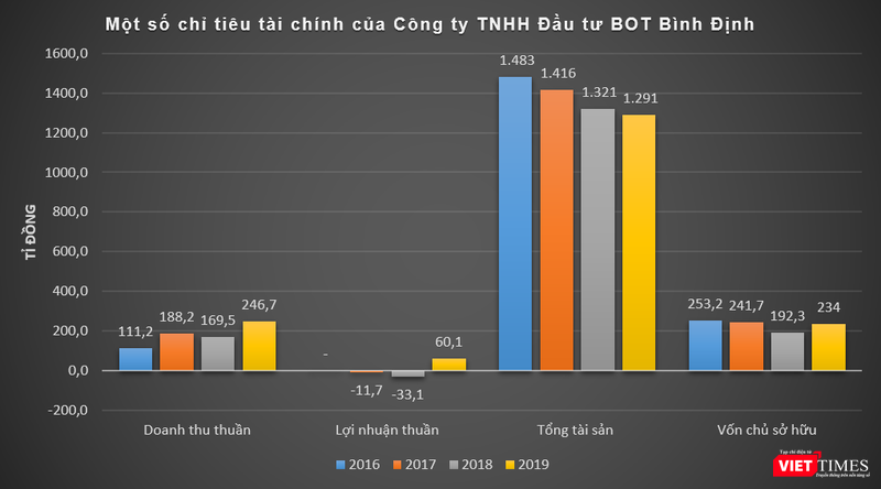 Dữ liệu của VietTimes cho thấy, năm 2019, BOT Bình Định ghi nhận doanh thu thuần đạt 246,7 tỉ đồng, báo lãi thuần ở mức 60,1 tỉ đồng, tương ứng với biên lợi nhuận 24% - tức cứ khoảng 4 đồng doanh thu, BOT Bình Định lại thu về 1 đồng lợi nhuận.