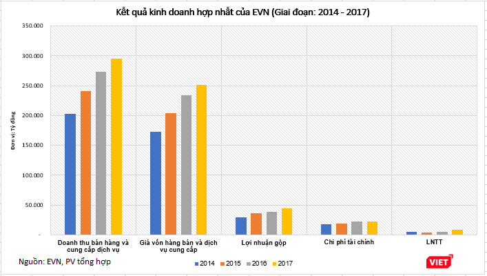 Báo cáo tài chính của EVN cho thấy, trong giai đoạn 2014 - 2017, tập đoàn này ghi nhận sự tăng trưởng khá tích cực trong doanh thu hàng năm. Tuy nhiên, chi phí giá vốn hàng bán và chi phí tài chính cũng có xu hướng tăng dẫn đến lợi nhuận sau thuế còn ở mức khiêm tốn so với quy mô tổng tài sản.