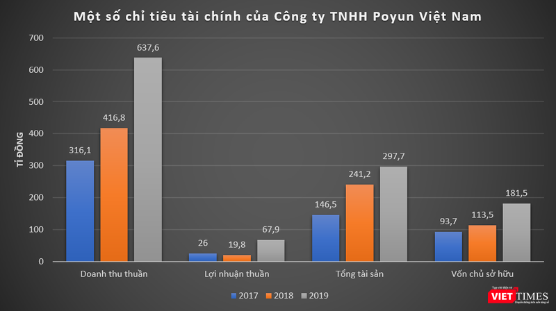 Về kết quả kinh doanh, dữ liệu của VietTimes cho thấy, trong giai đoạn 2017 – 2019, Poyun Việt Nam ghi nhận doanh thu tăng trưởng mạnh. Năm 2017 và 2018, doanh thu thuần của công ty này đạt lần lượt 316 tỉ đồng và 416,8 tỉ đồng, lãi thuần tương ứng ở mức 26 tỉ đồng và 19,8 tỉ đồng.
