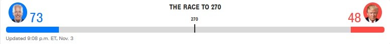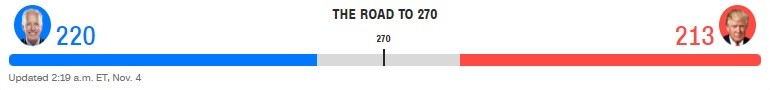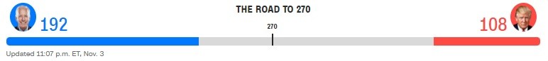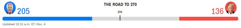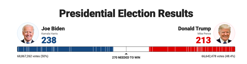 Hiện đang là sáng thứ Năm ở nước Mỹ, và cuộc đua vào Nhà Trắng vẫn quá sít sao để có thể gọi tên người chiến thắng. Tuy nhiên, trong lúc lá phiếu tiếp tục được kiểm đếm, cựu Phó Tổng thống Joe Biden tiến dần đến chiến thắng khi sắp giành đủ 270 phiếu đại cử tri.