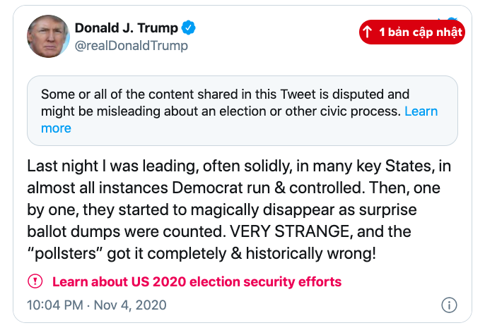 Trước sự tiến lên mạnh mẽ của ứng viên Joe Biden, Tổng thống Donald Trump vừa đăng tải một tweet thắc mắc về vị trí của mình. Ông viết: "Đêm qua tôi đã dẫn đầu, thường xuyên vững chắc ở nhiều bang chủ chốt nơi mà Đảng Dân chủ điều hành và kiểm soát. Sau đó, từng nơi một, cách biệt của tôi biến mất một cách kỳ lạ khi những lá phiếu được đếm. Rất kỳ lạ! “những người đi thăm dò ý kiến” đã sai hoàn toàn. Sai lầm lịch sử!".