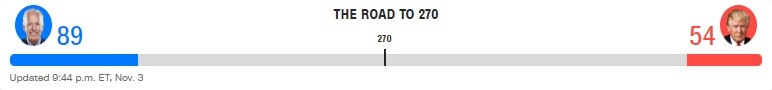 Hiện cựu Phó Tổng thống Joe Biden đang dẫn trước Tổng thống Trump về phiếu đại cử tri. Theo Fox News, tính đến 18h45 phút chiều 4/11 (giờ Việt Nam), ông Biden đã giành được 238 phiếu đại cử tri, còn ông Trump là 213 phiếu. Tuy nhiên, ông Trump vẫn còn cơ hội ở bang Michigan và Pennsylvania.