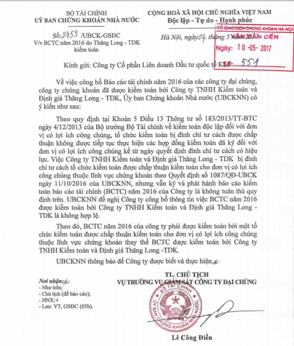 Liên quan đến vấn đề này, ngày 11/10/2016, UBCKNN đã ban hành Quyết định số 1087/QĐ-UBCK đình chỉ tư cách tổ chức kiểm toán độc lập được chấp thuận kiểm toán cho đơn vị có lợi ích công chúng thuộc lĩnh vực chứng khoán đối với Công ty TNHH Kiểm toán và Định giá Thăng Long – T.D.K kể từ ngày 11/10/2016 đến hết ngày 31/12/2016 theo quy định tại khoản 1 Điều 13 Thông tư số 183/2013/TT-BTC ngày 04/12/2013 của Bộ trưởng Bộ Tài chính về kiểm toán độc lập đối với đơn vị có lợi ích công chúng.