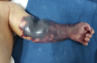 TS.BS. Đặng Ánh Dương – Phó trưởng khoa phụ trách Khoa Điều trị tích cực Ngoại khoa, BV Nhi Trung ương - cho biết: Bệnh nhi nhập viện trong tình trạng sốc nhiễm khuẩn, vùng bụng dọc theo vết mổ sưng nề, rỉ nước, đùi, bộ phận sinh dục bị hoại tử, đen, chảy nhiều mủ, mùi hôi, tinh hoàn đã bị cắt, chỉ còn lại 1 phần nhỏ dương vật, niệu đạo bị ăn mòn.