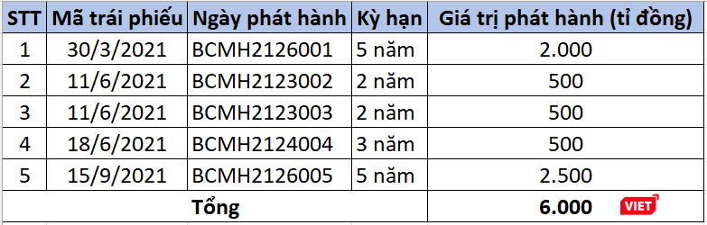 Riêng trong tháng 6/2021, Becamex IDC đã phát hành 3 lô trái phiếu lần lượt có mã BCMH2123002 (500 tỉ đồng), BCMH2123003 (500 tỉ đồng) và BCMH2124004 (500 tỉ đồng).