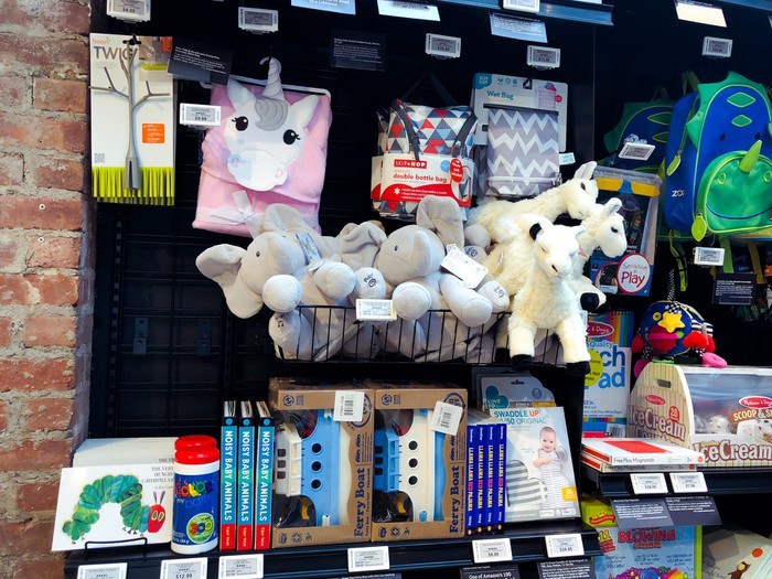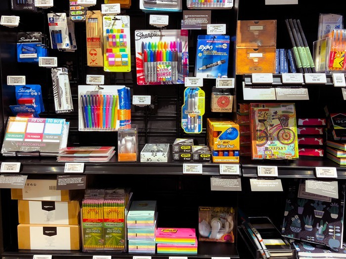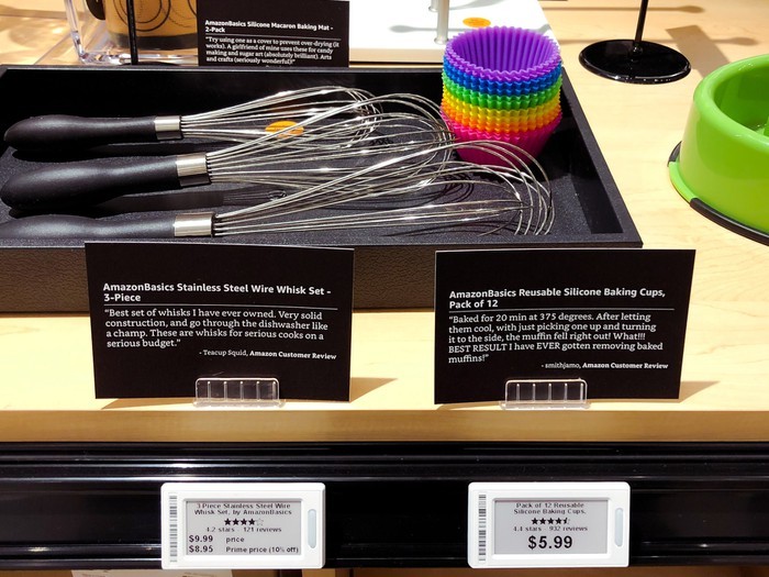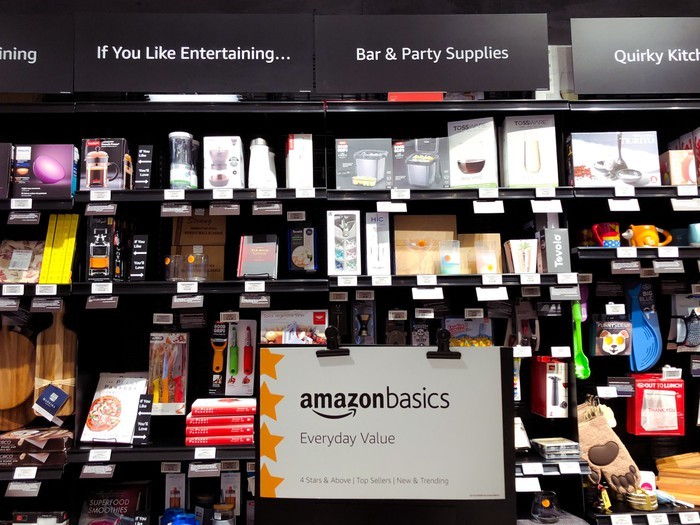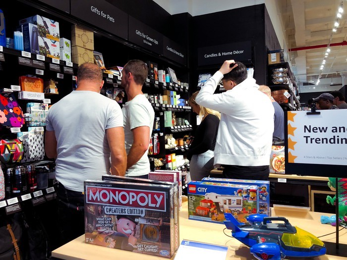 Các kệ hàng được phân loại giống như trên website của Amazon với các mục như "quà tặng cho thú cưng", "nến và trang trí nhà cửa", "Món đồ của ngày", "Thiết bị điện tử".