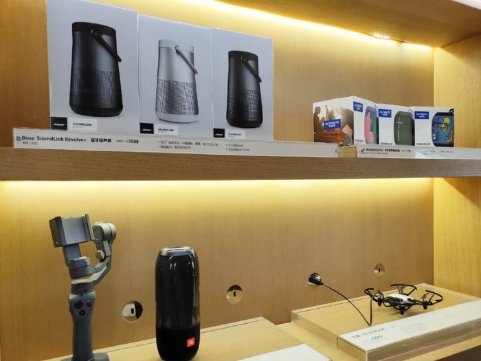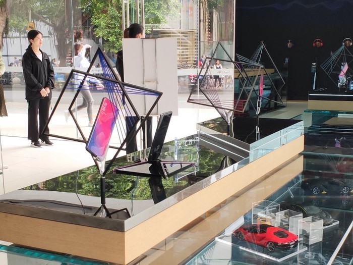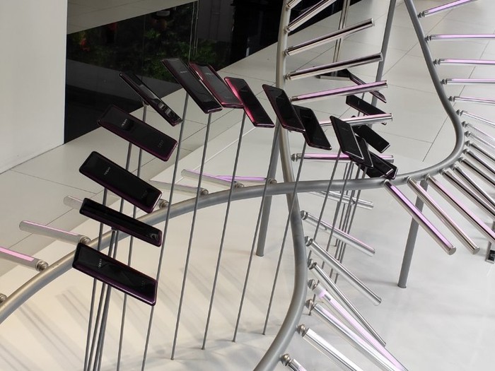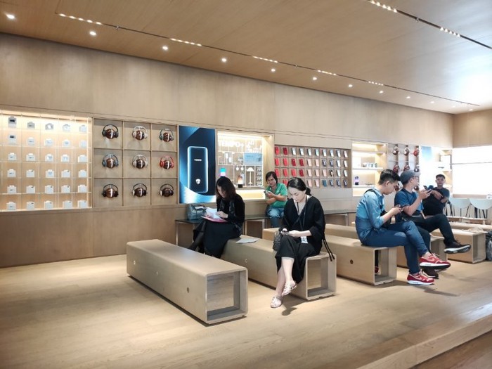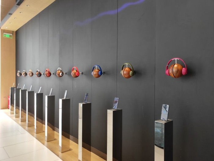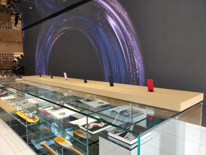 Các smartphone cao cấp của hãng được đặt 2 bên cửa hàng theo hàng dọc, và một dãy smartphone khác được đặt sát tường phía cuối cùng với tai nghe bố trí ở trên để người dùng trải nghiệm.